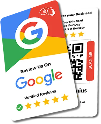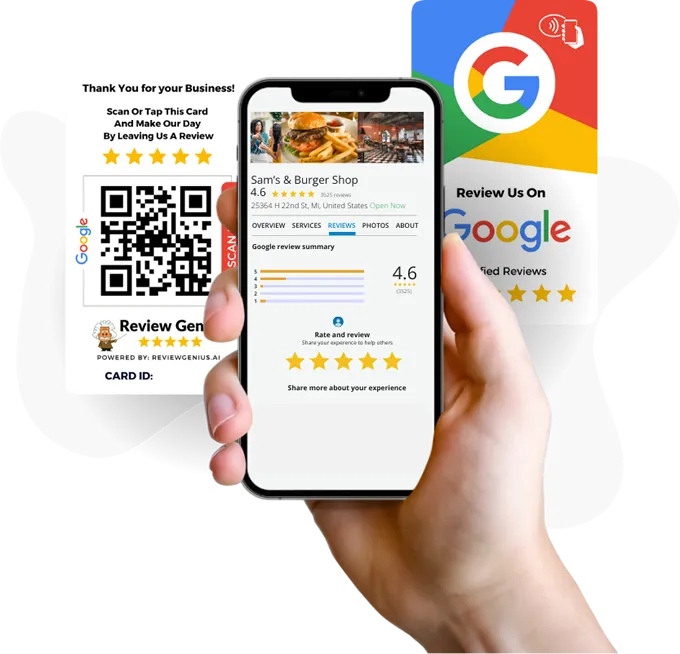 The cards have a QR code that can be easily scanned by any mobile phone. They're also powered by NFC (Near Field Communication) that allows users to tap their phone on the card to leave a review.